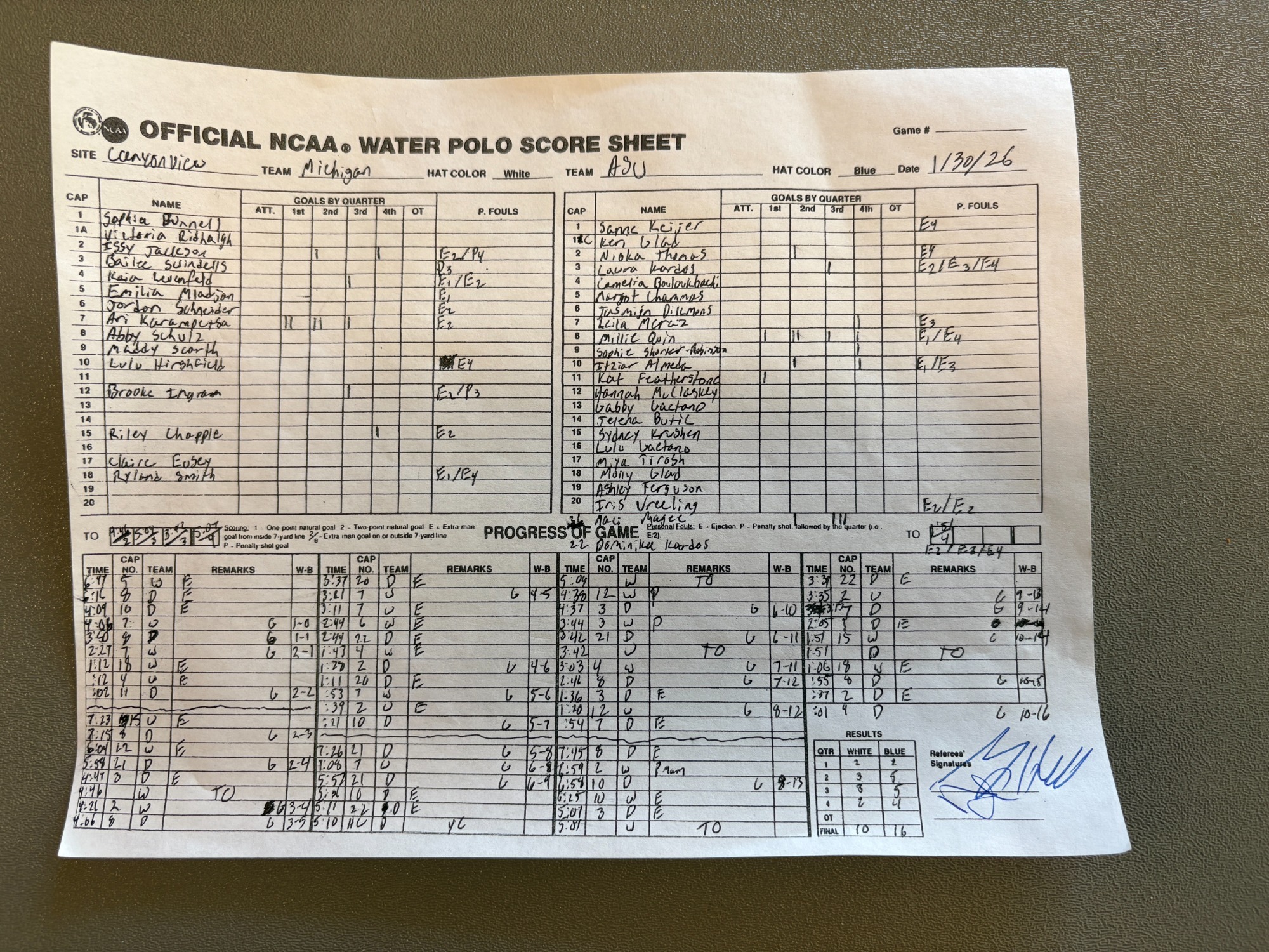 2:40 PM 6: Arizona State 16 vs. Michigan 10 Scoresheet