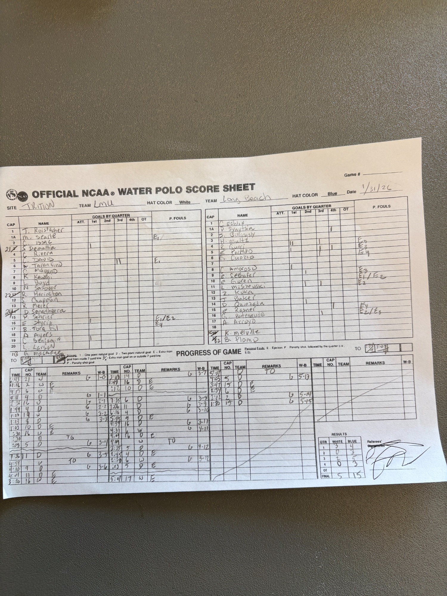 12:30 PM 12: Long Beach State 15 vs. Loyola Marymount 5 Scoresheet