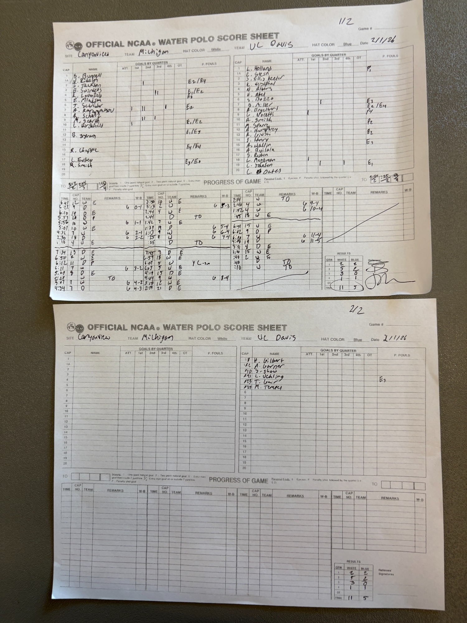 1 PM 28: UC Davis 5 vs. Michigan 11 (9th place) Scoresheet